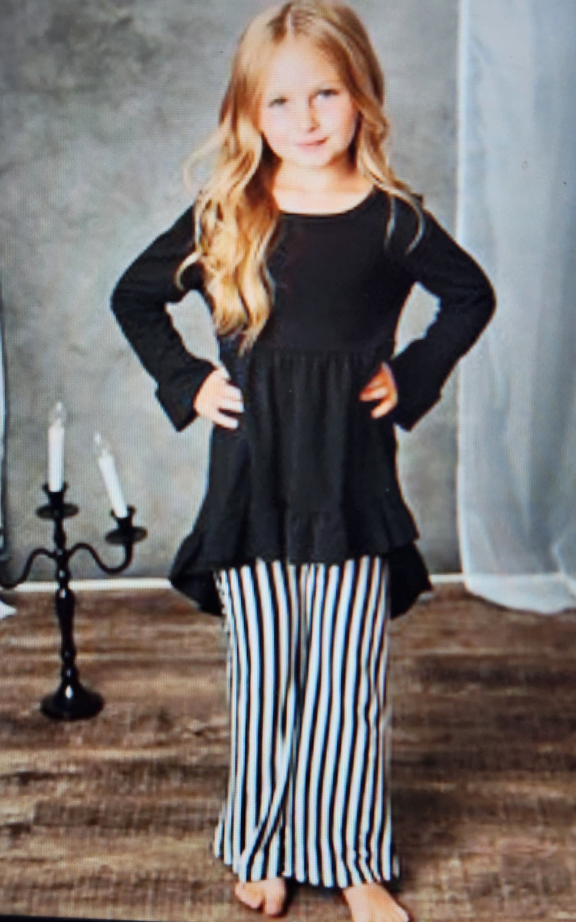 Black long sleeve tunic top with ruffle sleeve and hem details. Top 95% cotton 5 % spandex. Bottom 95% polyester, 5% spandex. Black and white stripe print.