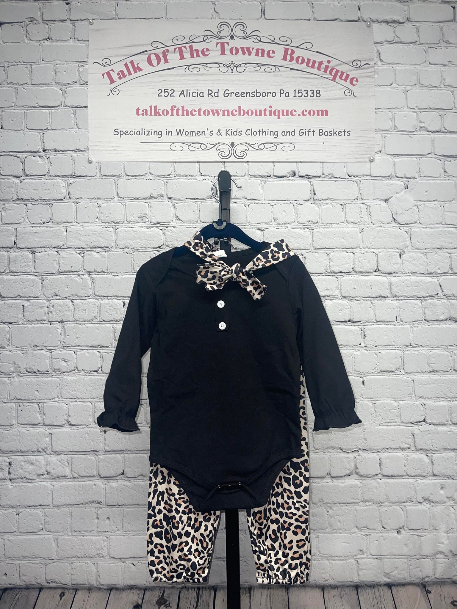 Baby girl black long sleeve romper and leopard printed pants with headband.