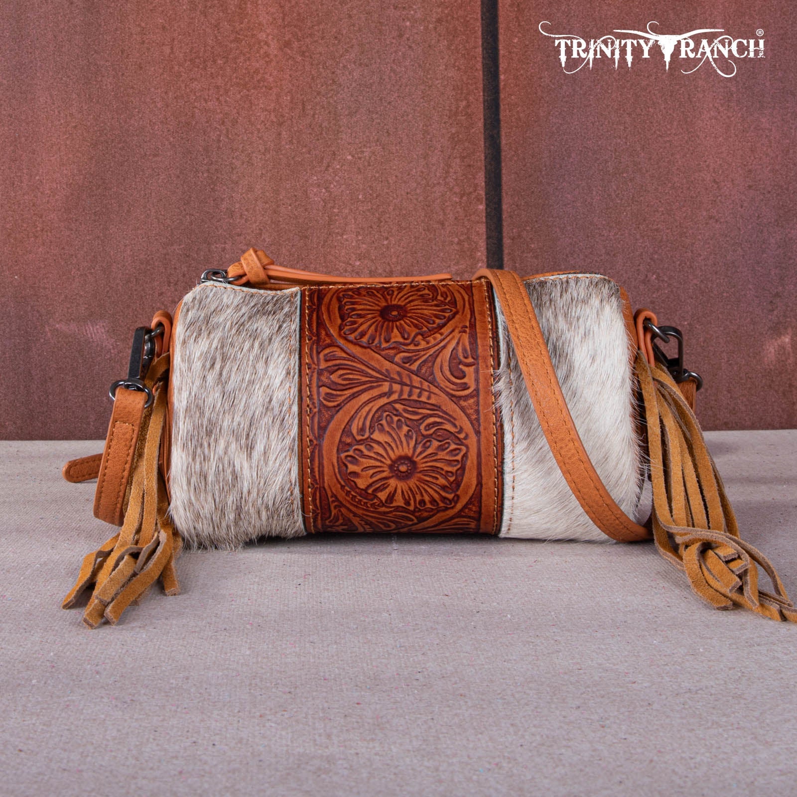 Montana West Trinity Ranch Genuine Hair-On Cowhide /Tooled Fringe Collection Barrel Crossbody