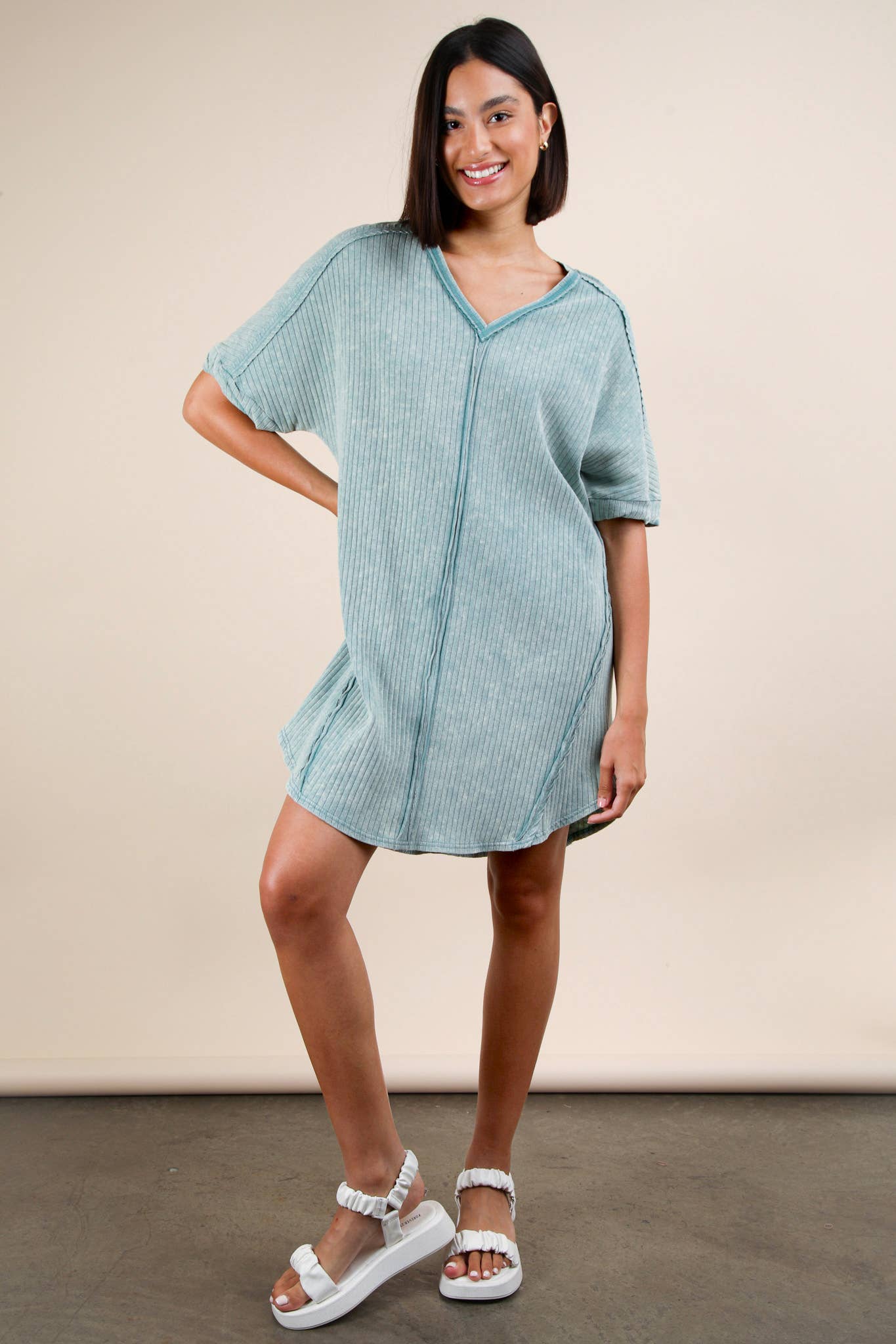 Mineral Washed Ribbed Knit Shift Mini Dress - V-Neck - Oversized - Drop Shoulder - Short Sleeve - Round Hi-lo Hem (Model height: 5"8", wearing a Small, 2-2-2 Size Ratio, NEW IN)